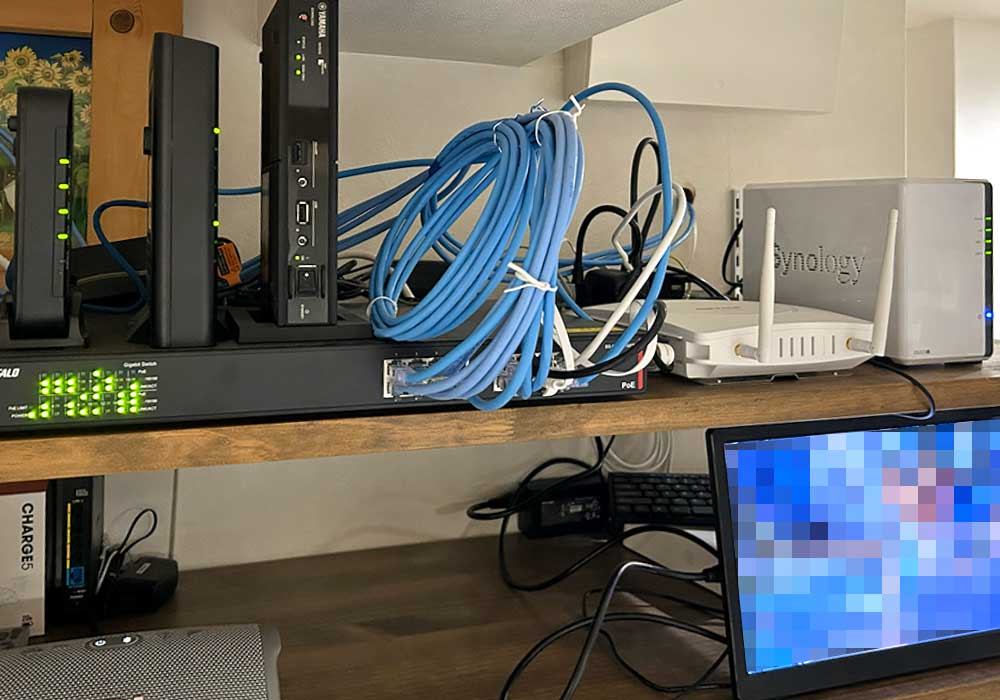 Wi-Fiアクセスポイントを含め一般家庭用のネットワーク機器で全てが構成されており、かつ業務上低速なフレッツ網を使用せざるを得ない状況であった為、業務に支障が出るほどのインターネット接続速度であった。
